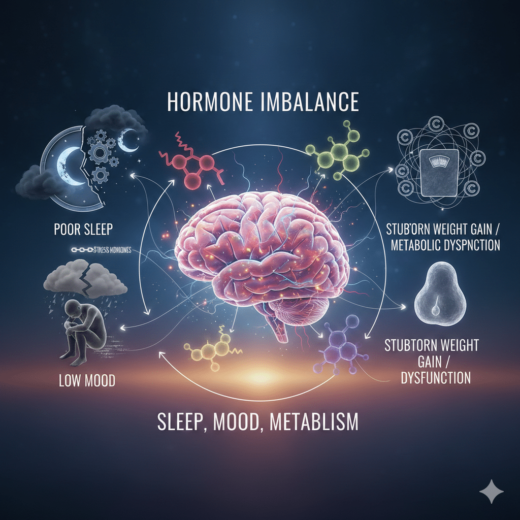 Hormone imbalance can disrupt sleep, mood, and metabolism by altering brain chemistry, stress response, insulin sensitivity, and circadian rhythms. These changes often reinforce each other, creating a cycle that worsens over time without proper evaluation.